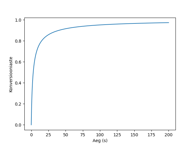 Vastuseks saame 40 sekundit. Võime ka joonist teha selleks, et näha, kuidas konversiooniaste muutub ajaga. Jooniselt võime näha, et kui tahame järjest suuremat konversiooniastet saavutada, siis vajalik viibimisaeg kasvab eksponentsiaalselt.